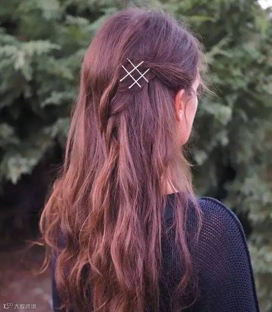 从头发的一侧分出一小撮头发,也可以是比较长的刘海,用发卡以一个井字形固定住就行了