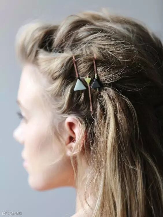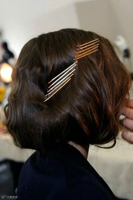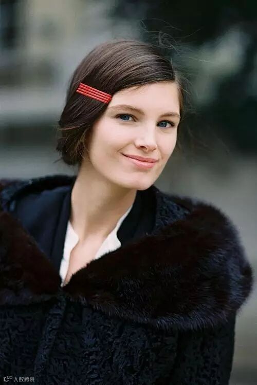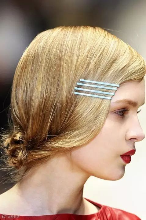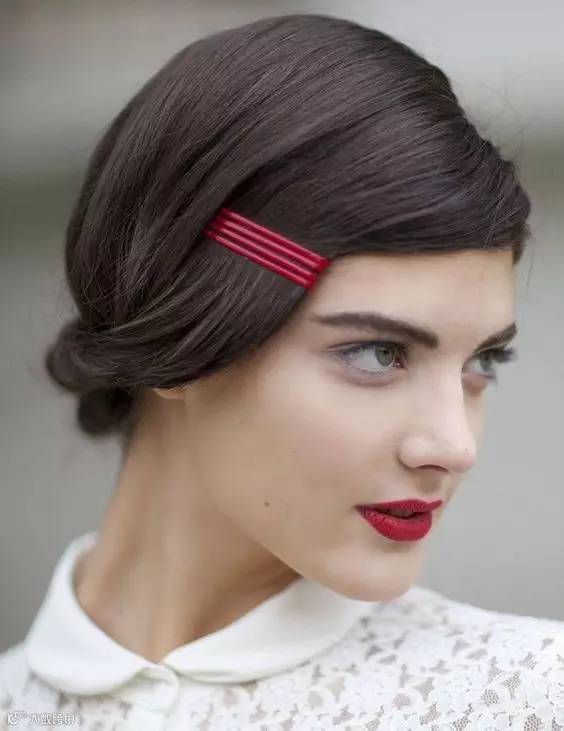 可以选择颜色鲜艳一点的颜色,平行紧凑的固定在刘海或者一侧的头发上,红色的复古,蓝色的活泼,金色的有个性~