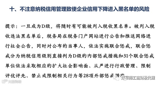 十、不注意纳税信用致使进入黑名单的风险孔子说,人而无信,不知其可也。社会主义核心价值观从个人行为层面凝炼出“爱国、敬业、诚信、友善”的基本道德规范。从古至今,诚实守信都是被注重和赞扬的行为。纳税信用也是如此。信用好,得激励。信用差,受惩戒。