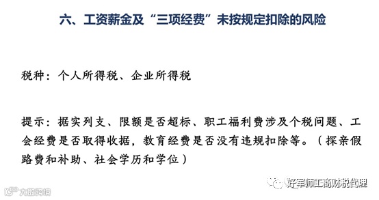 六、工资薪金及“三项经费”未按规定扣除看到这个风险提示,朋友不高兴了,说,这些都是老生常谈了,十几年的朋友,你能不能上点心,给点干货?这都是标准的干货,一点也没有兑水。工资薪金,指企业每一纳税年度支付给在本企业任职或者受雇的员工的所有现金形式或者非现金形式的劳动报酬,包括基本工资、奖金、津贴、补贴、年终加薪、加班工资,以及与员工任职或者受雇有关的其他支出。关键词是非现金形式。如果发放给员工个人是非现金,也要计入工资薪金扣缴个人所得税。《企业所得税法实施条例》第三十四条规定,企业发生的合理的工资、薪金支出,准予扣除。