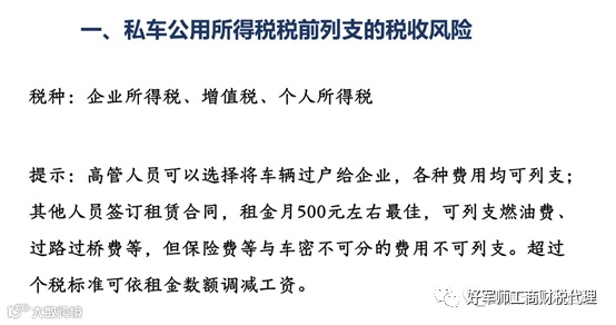 一、私车公用涉税风险点提示私车公用,这个话题已经说的太多了。因为这种行为在公司的生产经营之中,目前也是非常的普遍。对于私车公用业务,我们应当怎么来列支,才能防范一定的税收风险呢?如果是高管人员,我们可以选择,就把车辆过户给企业。作为企业自有的固定资产,燃油费、修理费、保险费、过路过桥费等等都可以税前列支。个人转让使用过的物品免征增值税。