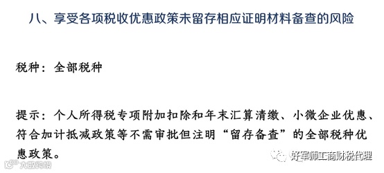 八、享受税收优惠未留存备查的风险享受各项税收优惠政策,一定要注意四个字,留存备查。个人所得税专项附加扣除、增值税加计抵减、各税种免征、减征政策等等,基本上自行申报即可享受优惠的,都离不开对相应材料“留存备查”的要求。别的不多说,如果后续管理中要求出具相应材料而无法提供,不但已经享受的政策不能继续,还有可能会被处于行政处罚。