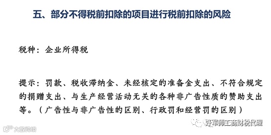 五、企业所得税限额扣除项目涉税风险朋友说,这个风险点可以不用提示了。我们刚做完汇算清缴,熟的很。好吧,那就简单说两句,不罗嗦。罚款指的行政罚款。比如交通罚款,环保罚款等等。滞纳金有定语,税收。也就是说,除了税务机关依法征收的滞纳金之外,其余滞纳金都是可以扣除的。另外,要区分什么样的情况下属于广告性的赞助支出,什么情况下属于非广告性质的。广告支出一定是为企业达到宣传的效果,广而告之。有曝光,有提高知名度的后果,可以判定为是广告性的。反之,则有可能会被认定为赞助支出。