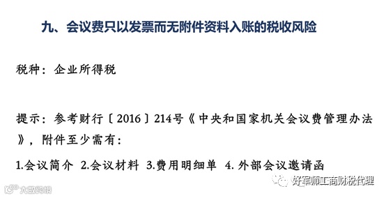 九、会议费无附件入账的税收风险朋友说,有一笔会议费支出,检查人员说原始凭证只有发票,找我要会议纪要和会议签到簿。我说,那你提供不就行了。朋友说,你真是死脑筋,如果有,还不早就放进凭证里去了。费用有发票不就可以了吗?还要什么纪要!我说,你这样想就不对了。看来真的需要帮你普及一下。会议费因为它本身的特殊性,包含住宿、餐饮、会务、福利等多项费用,因此检查时会特别关注。实务中可以参考文件《中央和国家机关会议费管理办法》(财行〔2016〕214号)规定,一般情况下需要附(包括但不限于)会议简介、会议材料、费用明细单、外部会议邀请函等资料。有些会议费原始凭证附的是大额的住宿发票和餐饮发票,这种更不可取。正常开会保存资料又有什么难度呢?因此,会议费列支请不要掉以轻心,更不要把会议费当作费用列支的万金油。