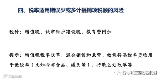 四、税率适用错误税率适用错误。导致少计或者多记销项税额的风险。主要是针对于新政策的发布。比如深化增值税改革而出台的一系列政策。还有就是要区分混合销售和兼营。应该适用兼营而错当做混合销售来处理,被税务机关发生后,从高适用税率。另外,不要把高税率的货物和低税率的货物进行混淆。比如购进农产品适用低税率,但是农产品如果被加工为罐头或者冷冻食品等等,就不再适用低税率,而是适用高税率了。还有城建税的税率,市区7%,县城和县属镇5%,其他1%。