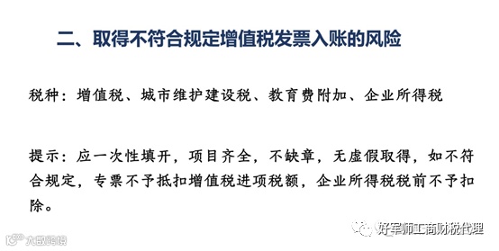 二、取得不符合规定增值税发票入账朋友说,哎呀,这个风险提示太简单啦。我们现在对于票面都检查的非常严格,一次性填开,备注栏填写,不能缺少发票专用章,不能虚假取得,这些都知道。对的,发票基本票面问题都不会犯错误啦。但税收中的风险就是这样防不胜防。曾经有这样一个案例。一张普通发票,货物名称是混凝土,票面各种问题都没有,填写非常规范。购买方是河南省某商贸公司,销售方是广西省某建筑材料公司。河南公司说,买混凝土是用于建设规划为五层的办公楼。检查人员问货物是广西的企业在本地有临时生产场所还是从广西直接送到河南的呢?答曰从广西购买,直接送来的。检查人员当时就断定,这笔业务是虚假的。为什么呢?
