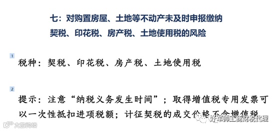 七、购置不动产未及时申报契印房土等税收的风险购置房屋和土地时,要注意小税种的申报和缴纳。朋友连连点头,说,没错。这次就着重检查小税种了呢。话说合并之后,所有税种统查,光是提供资料都让人头疼的不得了。没错,合并之后,再也不会出现各人自扫门前雪的情形了。来看一个稽查案例。检查人员对A企业2016年进行税务检查时,发现企业2016年7月份购进办公用房一处,建筑面积300平方,价税合计315万,取得了5%的增值税专用发票,2016年9月该房产交付使用,单位一直未取得房产证。财务人员以未办理房产证为由来解释一直未去税务机关申报缴纳契税、印花税、房产税、城镇土地使用税的原因。这个解释站的住脚吗?企业购入不动产应如何确认纳税义务时间?《中华人民共和国契税暂行条例》规定:契税的纳税义务发生时间,为纳税人签订土地、房屋权属转移合同的当天,或者纳税人取得其他具有土地、房屋权属合同性质的当天。纳税人应当自纳税义务发生之日起10日内,向土地、房屋所在地的契税征收机关办理纳税申报,并在契税征收机关核定的期限内缴纳税款。《中华人民共和国印花税暂行条例》规定:应纳税凭证应当于书立或者领受时贴花。根据印花税税目税率表,不动产转让按照“产权转移书据”征收印花税,税率为0.05%。根据以上规定,A企业应该在签订购房合同后及时申报缴纳印花税。《关于房产税、城镇土地使用税有关政策规定的通知》(国税发﹝2003﹞89号)第二条第一款规定:购置新建商品房,自房屋交付使用之次月起计征房产税和城镇土地使用税。根据此规定,A企业应该在2016年10月,也就是房产商交房的次月开始申报房产税与城镇土地使用税。因此,没有取得房产证不代表纳税义务没有发生。纳税义务发生时间,不仅仅体现这一个稽查案例之中,也不仅仅只限于小税种之中。增值税纳税义务发生时间也是需要重点关注的风险点。