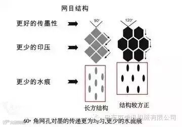 网目结构如果是90度,墨的传递会成长条形;如果是120度,结构会比较方正。如果用60度网孔,传墨性会更好,且印压更小和水流痕更少,如图所示。