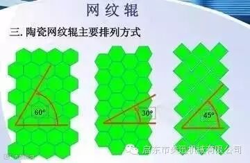 陶瓷网纹辊主要排列的方式,主要是网线排列的方向,与走向方向的夹角,所形成的一个度数,分为30°、45°、60°。一般的柔性版印刷机所采用的陶瓷网纹辊通常采用60°的排列方式,网穴呈正六边形。