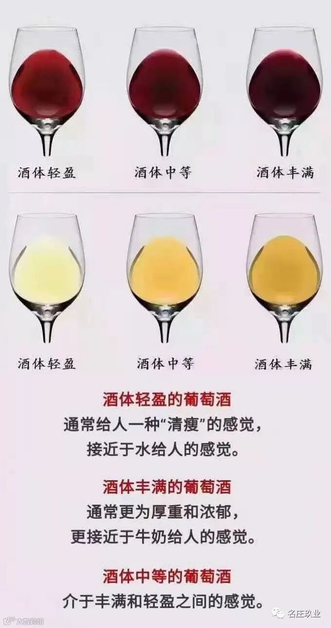 轻盈的酒体通常会给人一种“清淡”的感觉,接近于水的感觉;饱满的酒体往往会让人感觉更浓更浓,接近于全脂牛奶的感觉;中等的酒体介于水和牛奶之间。不如试试对比水,脱脂牛奶,全脂牛奶和酸奶所带给舌头不同的“重量感”。