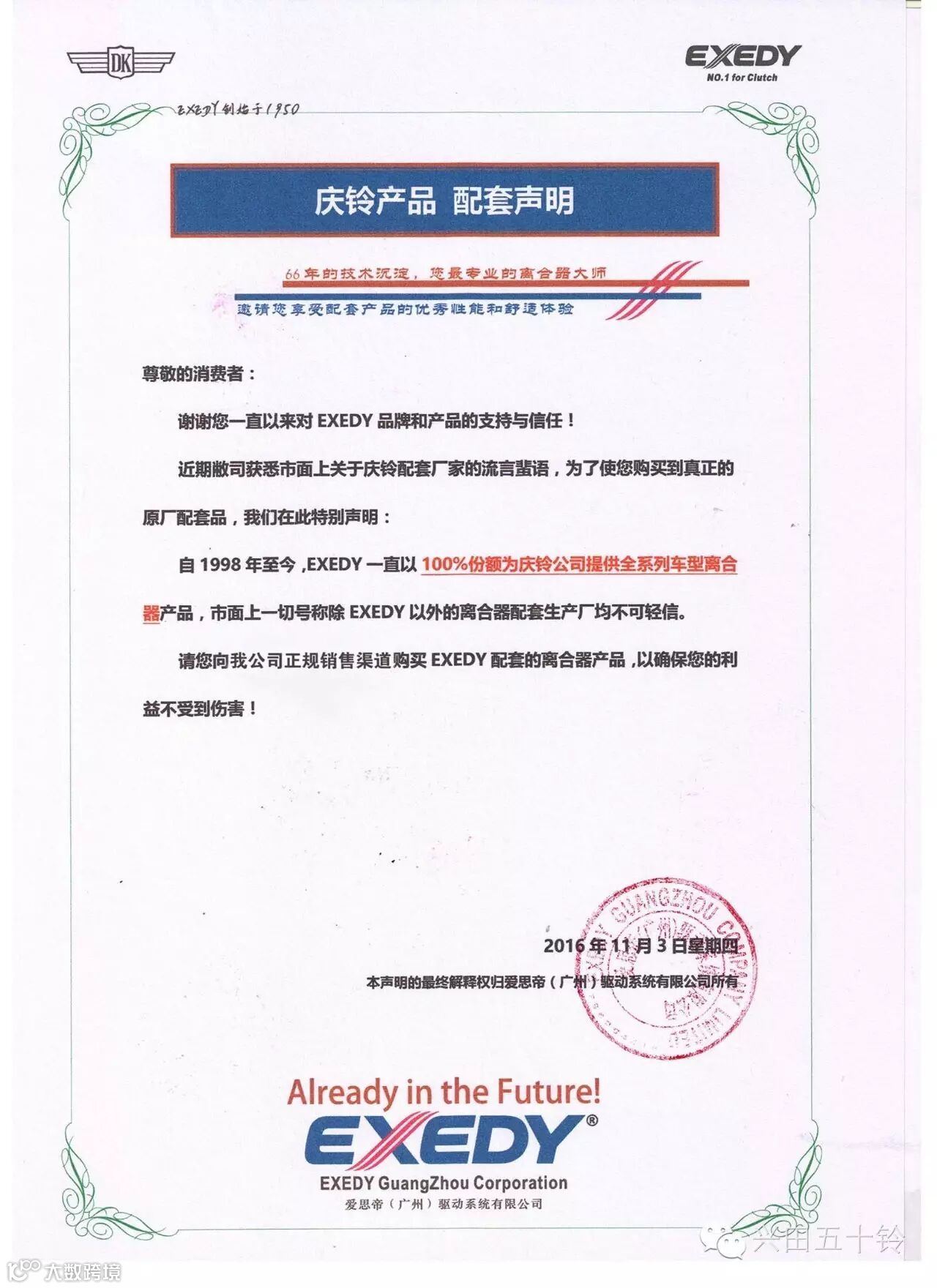 EXEDY庆铃产品郑重声明