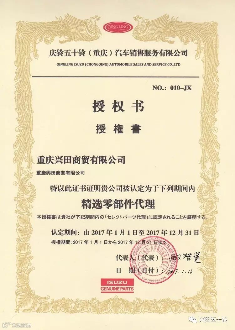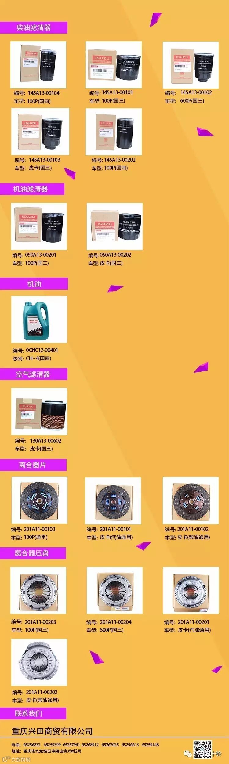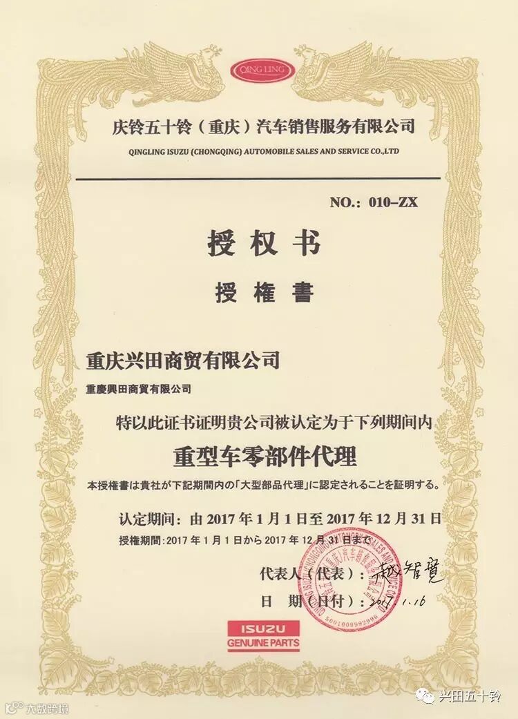 重庆兴田五十铃18年以来专业经营进口五十铃、庆铃、江铃配件,庆铃整车。公司秉承“质量第一,诚信共赢,专业高效”的经营理念,年经营产值超过6000万,拥有3000多家客户,遍布全国50多个大中城市。供应商达500多家,取得多家品牌的独家代理。