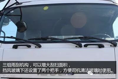 三组雨刮机构,可以增大刮扫面积,挡风玻璃下还设置了两个把手,方便司机清洁玻璃时使用。