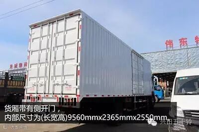 这款车加货厢的整车自重为10.5吨,与同级别国产车相比,自重较轻。并且,该车的货厢带有侧开门,其内部尺寸为(长宽高)9560mm×2365mm×2550mm。