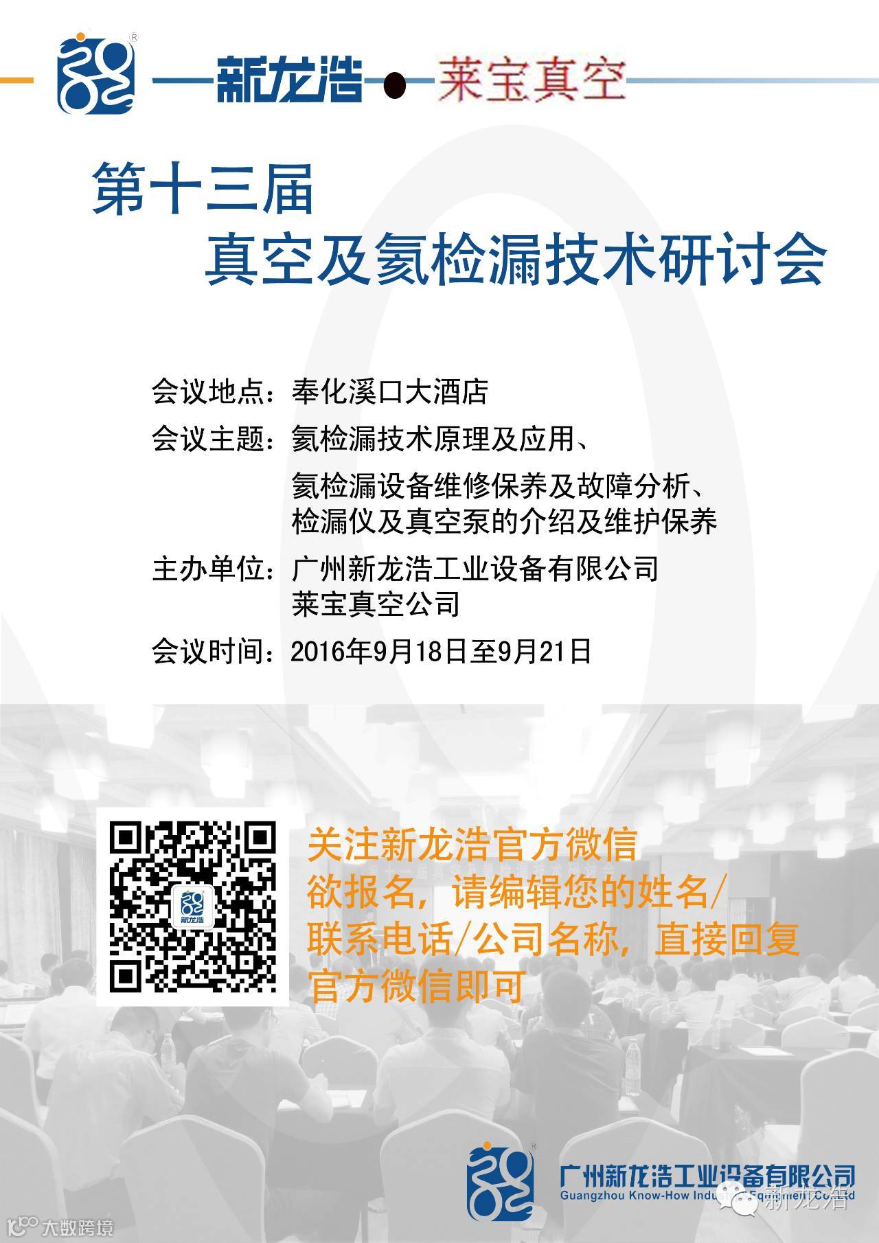为探讨真空氦检漏技术在汽车、新能源、制冷、电力及其它行业的应用及未来的发展,广州新龙浩公司 • 莱宝真空公司定于2016年9月18~21日在浙江省宁波市奉化市的溪口大酒店共同举办“真空及氦检漏技术研讨会”。