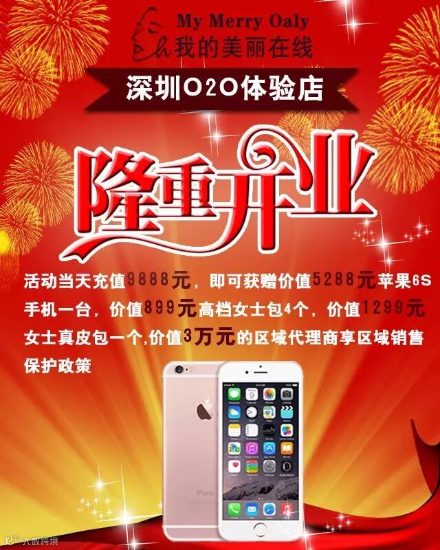 9.充值9888元,即可获赠 苹果6S手机一台,价值899元高档女士包4个,价值299元女士真皮包一个,价值3万元的区域代理商享区域销售保护政策。