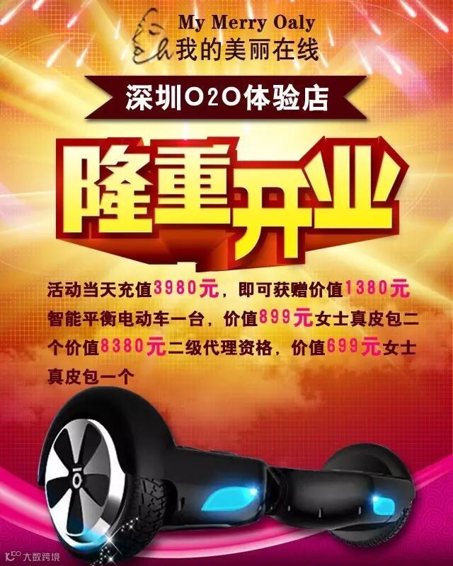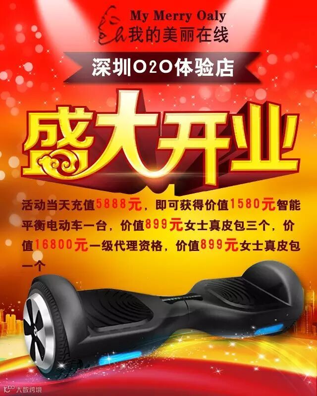 8.充值5888元,即可获得价值1580元智能平衡电动车一台,价值899元女士真皮包三个,价值16800元一级代理资格,价值299元女士真皮包一个。