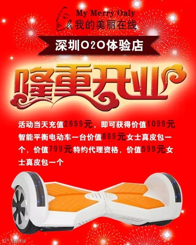 6.充值2699元,即可获得价值1099元智能平衡电动车一台,价值899元女士真皮包一个,价值799元特约代理资格,价值299元女士真皮包一个。