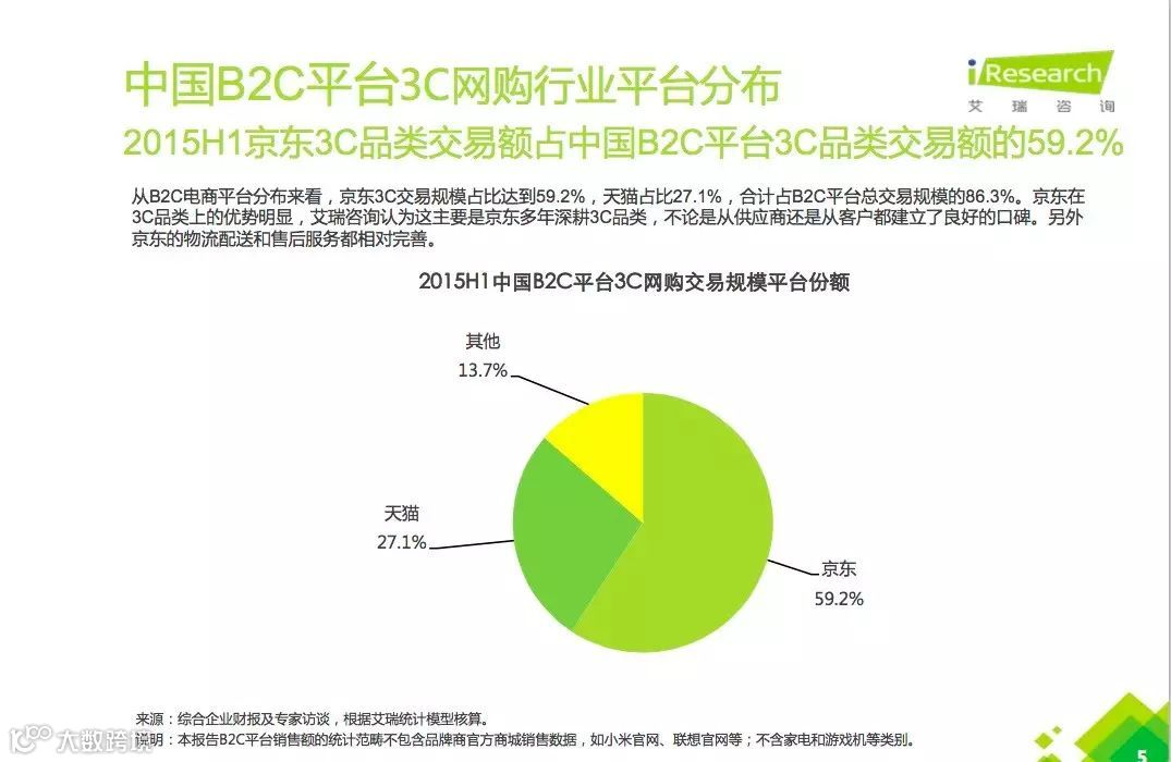 2015年Q2,B2C网购第一次超越C2C达到50.7% ,而在最受关注的3C领域,京东更以59.2%的市场占比领先其他电商。