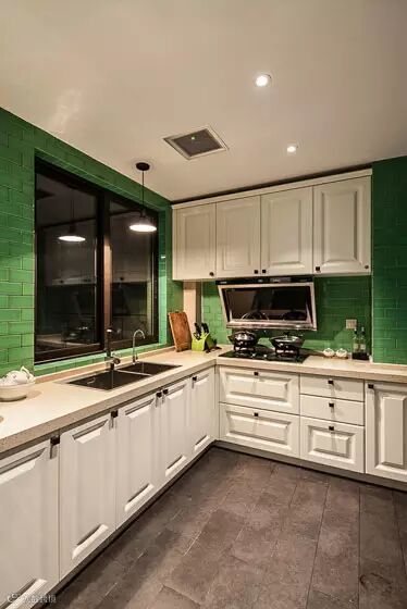 厨房使用了健康的绿色砖状设计,很有田园风格的情调。