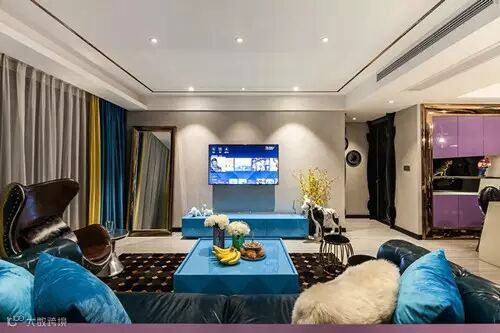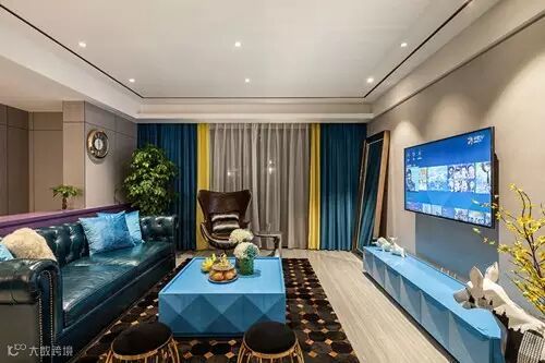 茶几和电视柜是侧面带有立体效果的,沙发、窗帘、一套茶几颜色特别搭。