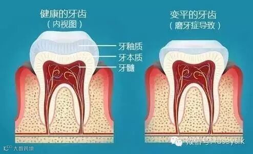 对牙釉质产生破坏,导致牙体组织严重磨损(见下图);