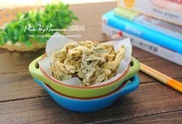 6.炸好的香椿鱼儿用吸油纸吸一下表面多余的油脂,撒适量的椒盐后食用味道更佳2 香椿豆腐堡