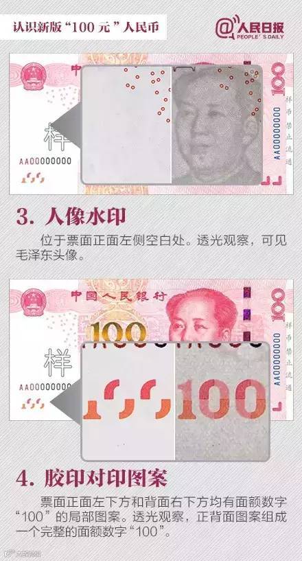④对光看,正面左下角和背面右下角图案形成完整“100”……