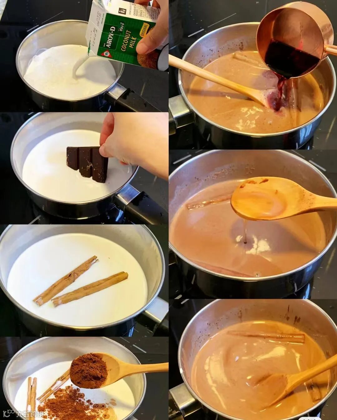 融化的巧克力配上清新的红酒,口感醇香又丝滑,清爽不腻,像酒心巧克力一样,让人欲罢不能。制作也非常简单,在寒冷的冬日喝上一杯热可可,快乐加倍,温暖加倍,快来试试吧~