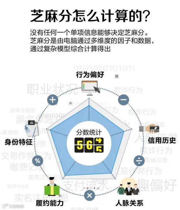 这一看似简单的分数,背后是芝麻信用对海量信息数据的综合处理和评估,主要包含了用户信用历史、行为偏好、履约能力、身份特质、人脉关系五个维度。