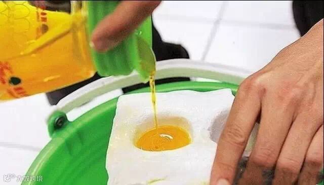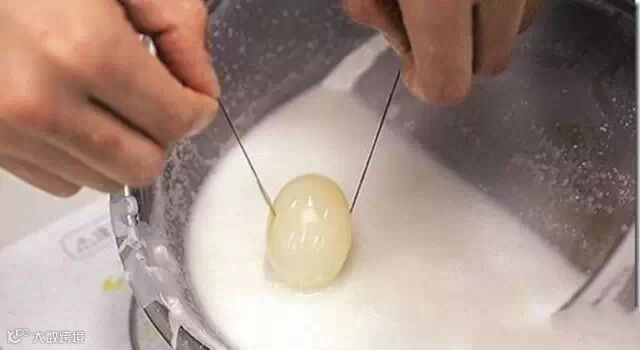 6.将磨具放入特制的溶液中,慢慢摇晃让“蛋黄”成型。