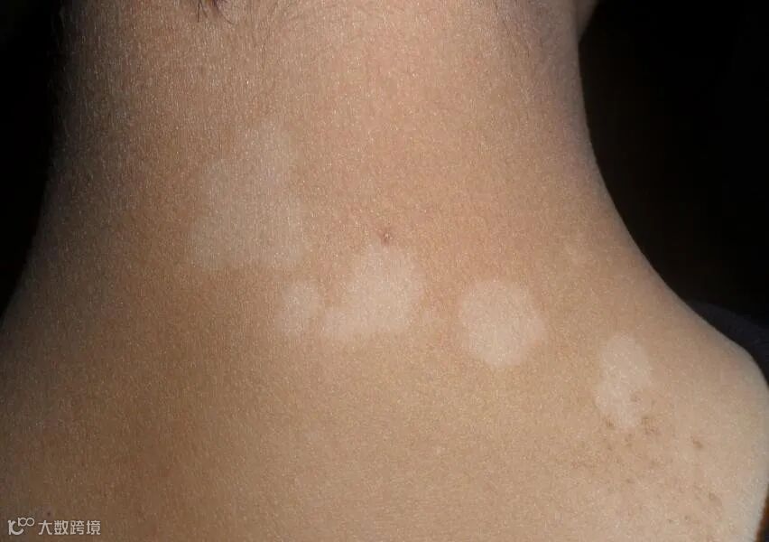 乳白色:中度中期色素脱失,皮损部位还残余部分色素。