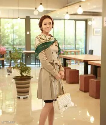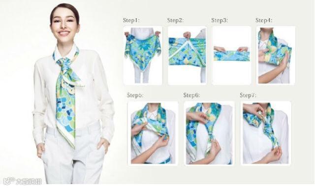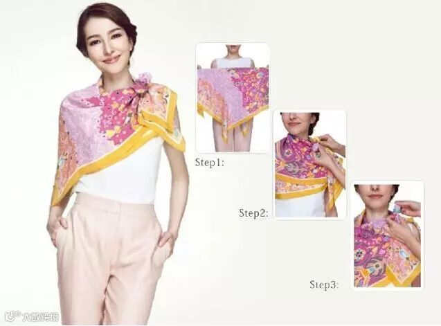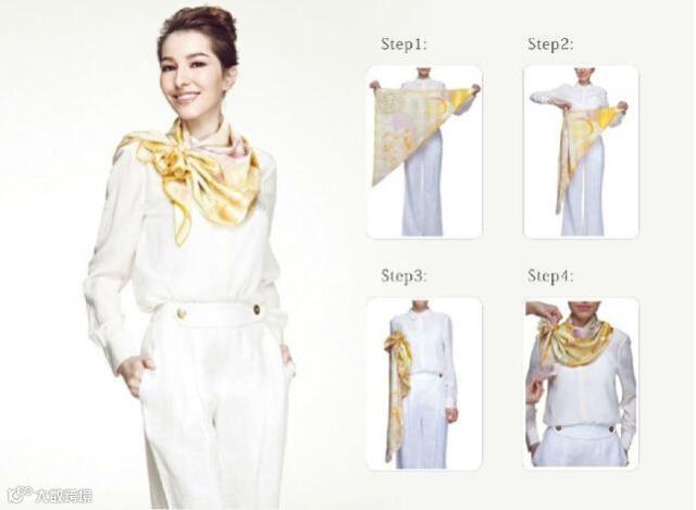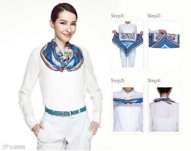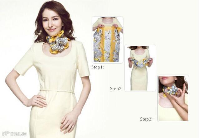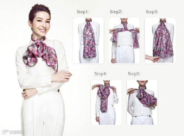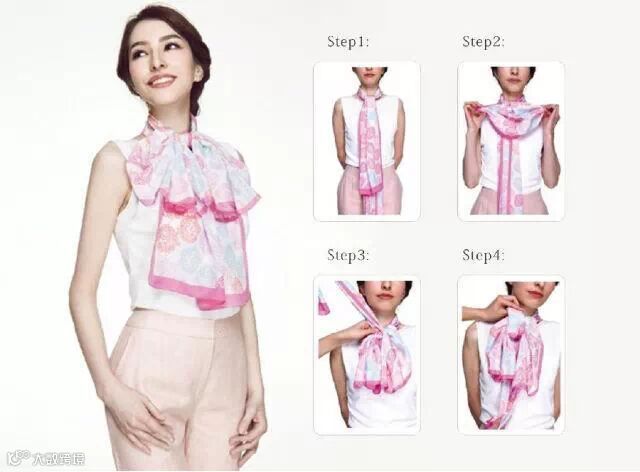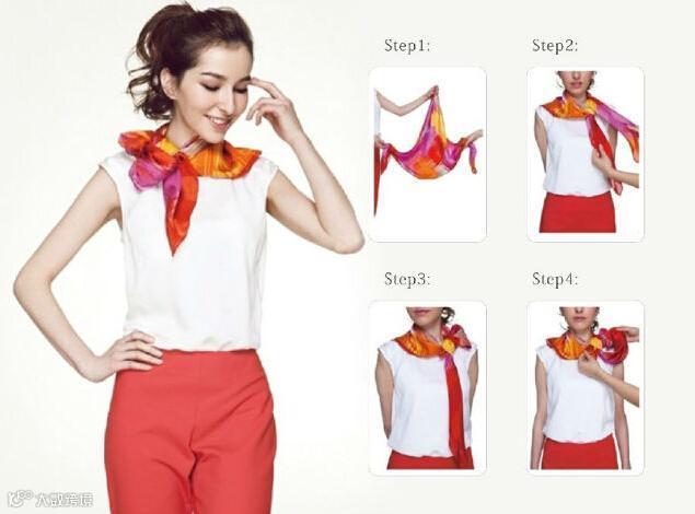 Step4:将丝巾扣放在胸前、两头绕于脖子后面系结,再整理前面的丝巾。