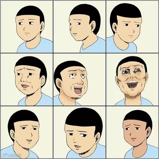 这表情原型来自搞笑漫画日和第一季第一集《贴纸》,这是熊孩子贴纸九连拍的其中之一。