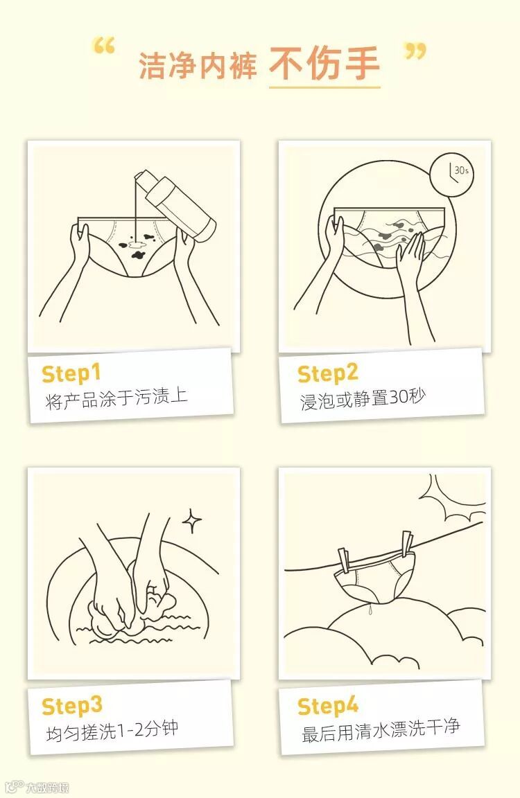 蛋白酶可以将蛋白质水解,轻松分解血渍、白带、分泌物等各种污渍,放置时间久的污渍同样适用(不过为了健康考虑,小内内还是要及时清洗哦)