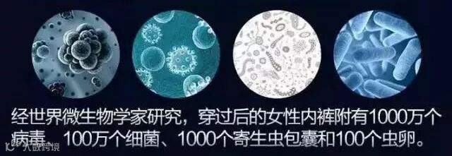 大家都知道内裤上每天都会有上千万细菌,据各国微生物学家经过大量研究,一条穿过的内裤平均带有0.1克粪便,排泄物中含有甲肝病毒、轮状病毒、沙门氏菌及大肠杆菌等大量病菌。