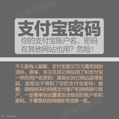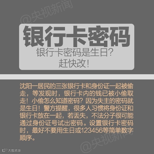 设置密码及保密,是每个人都会遇到的事情。为安全起见,大家所有网络账户尽量不要使用相同的用户名和密码,尤其与钱相关的账户,务必要设置最高安全级别以及单独的密码。生活中,有哪些密码一定要保护好?看下图告诉你!