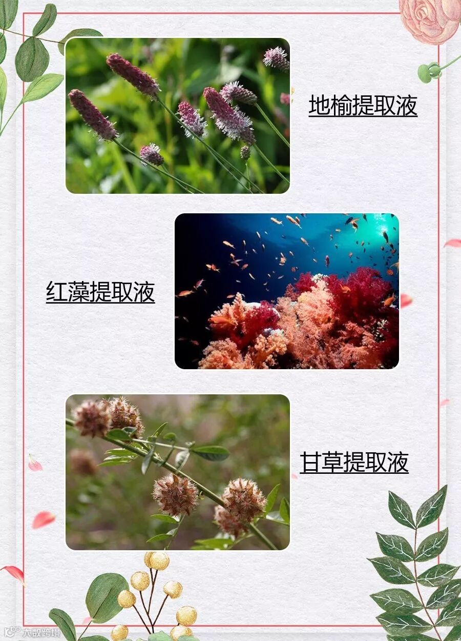 抗老丝胶主成分之外,奢华搭配地榆提取液、红藻提取液、甘草提取液等抗老成分。