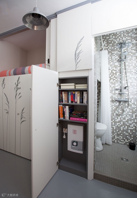 厨房,卫生间,床,衣柜,书架都有,真是麻雀虽小,五脏俱全。看起来非常简单素雅,住在这样一个公寓里,虽小但也别有一番风味。