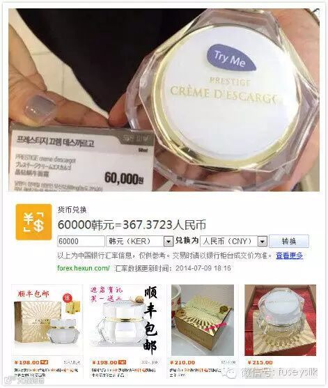 蜗牛霜在韩国买折合人民币都要367元,官网会员订购也不可能低于8折,而在淘宝上销量比较好的几家店的价格⊙﹏⊙b汗!小伙伴们算算,如果你是老板,你会卖多少钱?你要是相信,那特务Z真是被你的天真打败了!