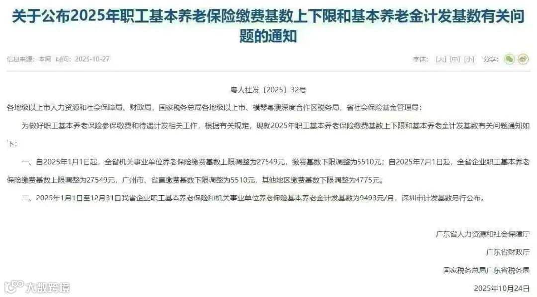 一、自2025年1月1日起,全省机关事业单位养老保险缴费基数上限调整为27549元,缴费基数下限调整为5510元;自2025年7月1日起,全省企业职工基本养老保险缴费基数上限调整为27549元,广州市、省直缴费基数下限调整为5510元,其他地区缴费基数下限调整为4775元。