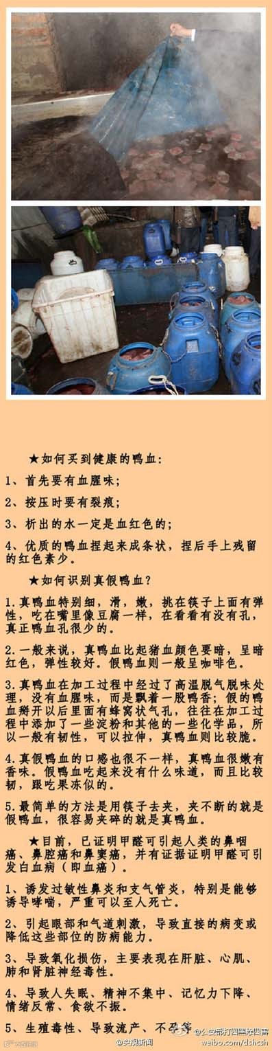 据荆楚网,近日湖北十堰市公安局侦破一起"毒鸭血"案,抓获了两名主要犯罪嫌疑人。经调查,宣称"鸭血"却偏偏不含鸭血,是由鸡牛羊等动物血添加甲醛制成。研究表明,甲醛具有强烈的致癌和促癌作用,对人身体危害极大。