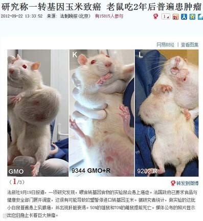 200 只白鼠食用美转基因玉米后普遍患癌。法国科学家经过对小白鼠长达两年的实验,做实验的这批小白鼠普遍患上乳腺癌,并出现肝脏衰竭现象。50%的雄鼠和 70%的雌鼠提前死亡。食物主要是孟山都公司推出的"nk603"转基因玉米。公布的照片显示出它们身上长着巨大肿瘤。