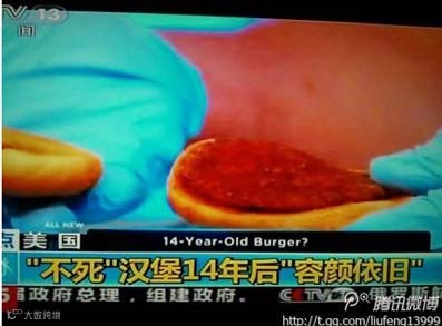 据央视新闻 24小时播报:美国一男子,将存放14年之久的汉堡拿出,送往某食品健康节目鉴定,内含有大量防腐剂,对人体有极大伤害。希望大家为了健康,少食用此类食品