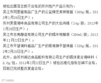 江苏省质监局发布了2013年一季度食品监督抽查结果。苏州接受抽检的170多个批次地产食品中,5个批次的调味料上了不合格名单。其中,有4个批次的产品均被检出菌落总数超标。
