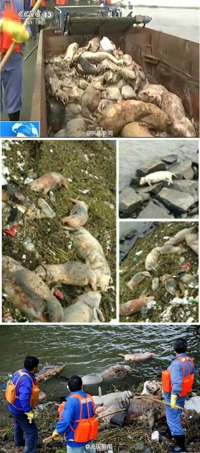 据新华网,截至到3月20日,从黄浦江中打捞起的死猪达到10395具。嘉兴餐饮业老板表示:"上海人以前不知道吃过多少死猪。"他还透露,就在黄浦江死猪事件爆发前,当地农民还把死猪放路边,黎明前就会被捡走,死猪会用小面包运往上海等地。