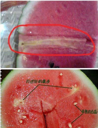 "打针西瓜"所注射的禁用食品添加剂甜蜜素和胭脂红!打过针的西瓜瓜瓤呈红色,汁液也很"丰富",但没有一点西瓜味。所用添加剂破坏人体肝脏、肾脏的功能、影响儿童智力发育等毒性。