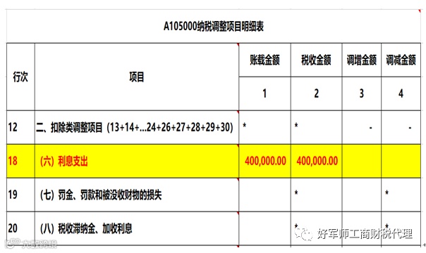 第18行“(六)利息支出”:第1列“账载金额”填报纳税人向非金融企业借款,会计核算计入当期损益的利息支出的金额。发行永续债的利息支出不在本行填报。第2列“税收金额”填报按照税收规定允许税前扣除的利息支出的金额。若第1列≥第2列,第3列“调增金额”填报第1-2列金额。若第1列<第2列,第4列“调减金额”填报第1-2列金额的绝对值。