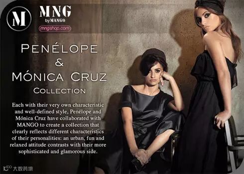 来自西班牙的品牌邀了佩内洛普-克鲁兹与妹妹莫妮卡-克鲁兹一起拍摄了MANGO 07秋冬的全球广告,同时佩内洛普首度亲自为MANGO设计了一系列秋冬成衣作品,并命名为Penélope & Mónica Cruz for MNG限量系列。