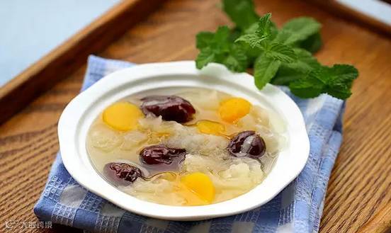 银耳红枣汤是用银耳、红枣、冰糖等材料煮制。红枣能补血,银耳能抗衰老、祛斑、美容润肤,还能增强免疫力。